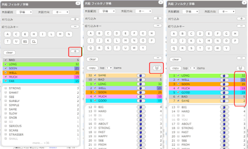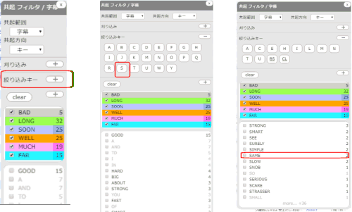 - 共起フィルタ小窓が横に広がりアルファベットボタンが現れる