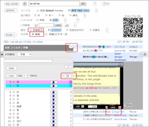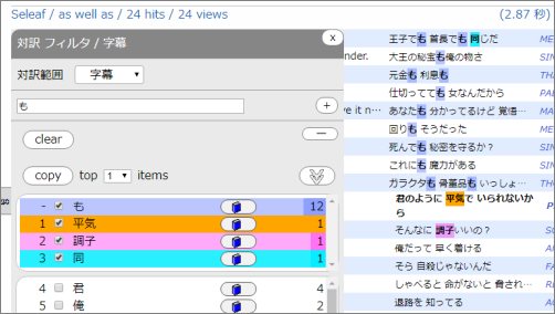 」小窓には 訳文字幕にある熟語(単漢字も含む)が出現頻度順に並んでいる