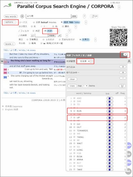 対訳コーパス・CORPORA で “run up” の用例を調べることで、“走り寄る” の英語表現として “run up” が適しているのかを、以下の手順で確かめる。