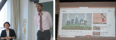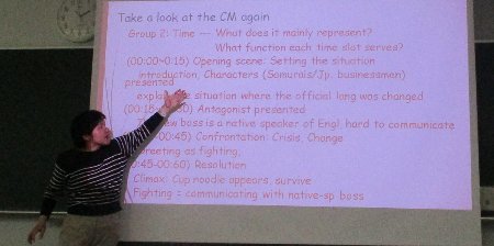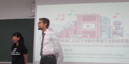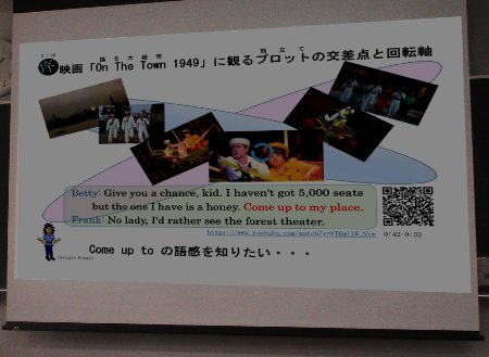映画を使った英語の授業を、文化と言語の両面から深掘りする教授法を探求する研究の一例として、映画「On The Town(踊る大紐育)1949」から、軍艦を下船し街に繰り出した水兵をタクシードライバー(女性)が誘うシーンの表現「Come up to my place.」が持つナンパな気持ちを、「Come to my home.」と比較しつつ、コーパスを使って解き明かしていく発表であった。