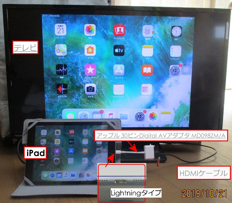 - AVアダプタはiPadの端子に合わせて、ここでは アップル 30ピンDigital AVアダプタ MD098ZM/A を使った。6千円近くかかる。