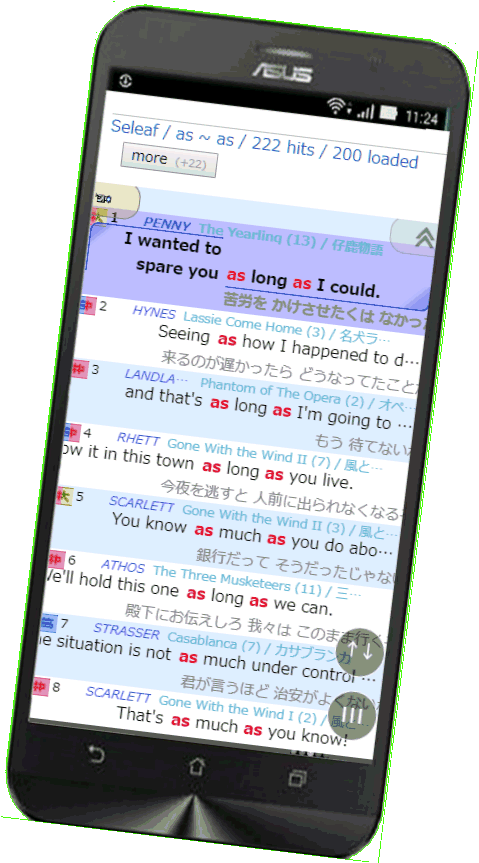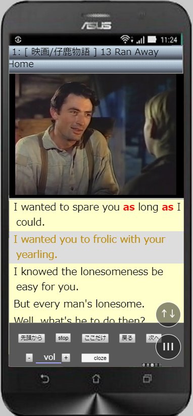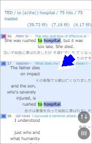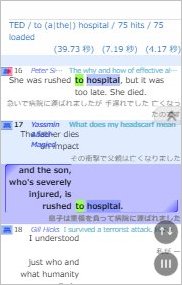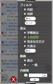 このとき、さっきの go 検索時と違って、動画が表示されてないことに気づいただろうか? これは、共起フィルタを使った時に、画像欄が隠されたのだが、その設定がそのまま続いているからである。表示するには、動画を観たい字幕を1度あるいは2度タップする。