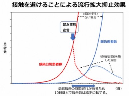 - しかし、現時点で、人々が急速な感染拡大を抑制するために適切な行動へ切り替えれば、新規の感染者数は急速に減少していくと見込まれます(赤い点線)。これがうまくいけば、今後、患者数が急激に増えることはありません(青い点線)。ただし、潜伏期間があるため、患者数の減少が確認できるまでにはタイムラグがありますので、人々の行動が大きく変わってから2週間ほど経過しないと、その効果を評価することはできません。