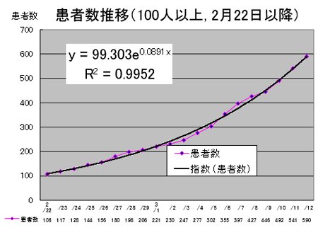 その後しばらく進退を繰り返した後、2月11日以降は毎日患者が見つかるようになり、2月22日に100人を超え、3月12日現在で患者数は590人に達している。