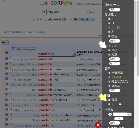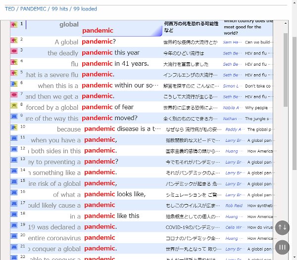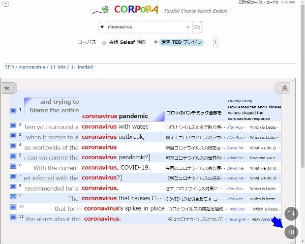 英日対訳コーパス・CORPORA・TED コーパスでの「コロナ」検索結果