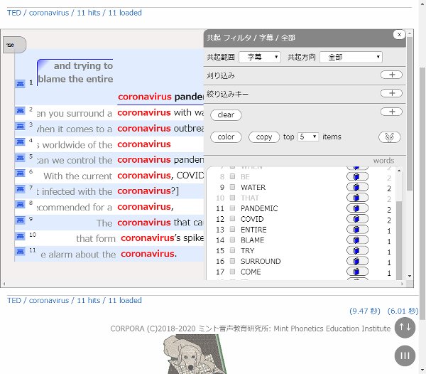 英日対訳コーパス・CORPORA・TED コーパスでの「coronavirus」検索結果