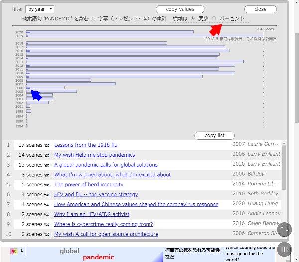 - 図表上段の「パーセント」(赤色の矢印)をクリックすると PANDEMIC を扱った Talks の相対的割合がわかる