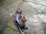 う・・・。凶暴な猿がいたらどうぢよう・・・とドキドキしながら進む。第一猿集団、発見!接触を試みる。バナナを一本投げると、拾って食べてます。んが、次第に怖くなってくる。そう、お猿はとってもバナナ好き。バナナを持っていると接近してくるのだ。日本のお猿は怖いイメージがあるじゃない?可愛いけど、近づかないでくれー!と遠くにバナナを投げる。で、進むとさっきのよりも大きいお猿が「チョーダイ」と接近してくる。こんな幼児並みの大きさに近づかれたらと、恐怖でもう一本投げる。で、またどこからか大きめのが来ると遠くへバナナを投げて・・・、とこんなんしていたらバナナ足りません!小猿にあげたいのに〜(涙)緑の服を着ている係員の人に手まねで「石に座ってあげればよい」と言われるが、恐くてできませんがな。ということで、旅の友にバナナを渡したら、なんとお猿はズボンのすそを可愛らしく掴んでおりましたわ。で、あげないわけにはいかないのでバナナを放る〜ということで、あっという間にバナナは消えました。恐怖アイテム・バナナ。ようやく中心部のお寺前についたら西洋人の団体が。一緒にお猿の写真を撮ったりしていたら、なんと猿に乗りかかられているご夫人が(汗)。キャーキャー喜んでおられましたわ。日本の猿ほど凶暴性はなさそうだが、私なら失神してますな・・・・。アイテムを無くした我らはお猿王国内をゆっくり散策して、小猿やら可愛らしく蚤取りしている親子猿を見てました。