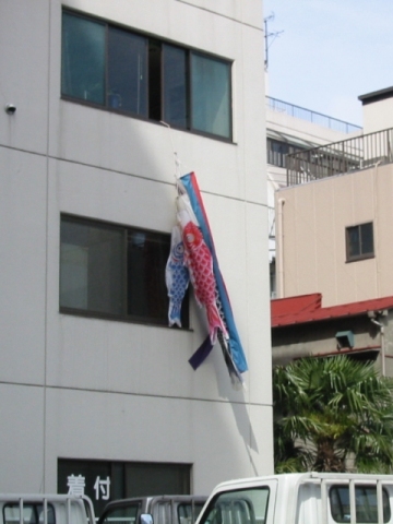 何だか哀れな鯉のぼり。「のぼり」は「のぼり」でも、 ビルの壁を「よじ登ってる」よーなカンジ。(爆) 住宅事情もさることながら、窓から吊してるんじゃあ、風が吹いたって 泳がないでしょうなぁ。横風でも吹けば多少は違うでしょうけど。(^_^;) せめて、竿くらい立ててあげて欲しいよなぁ。 (横浜市中区某所にて)