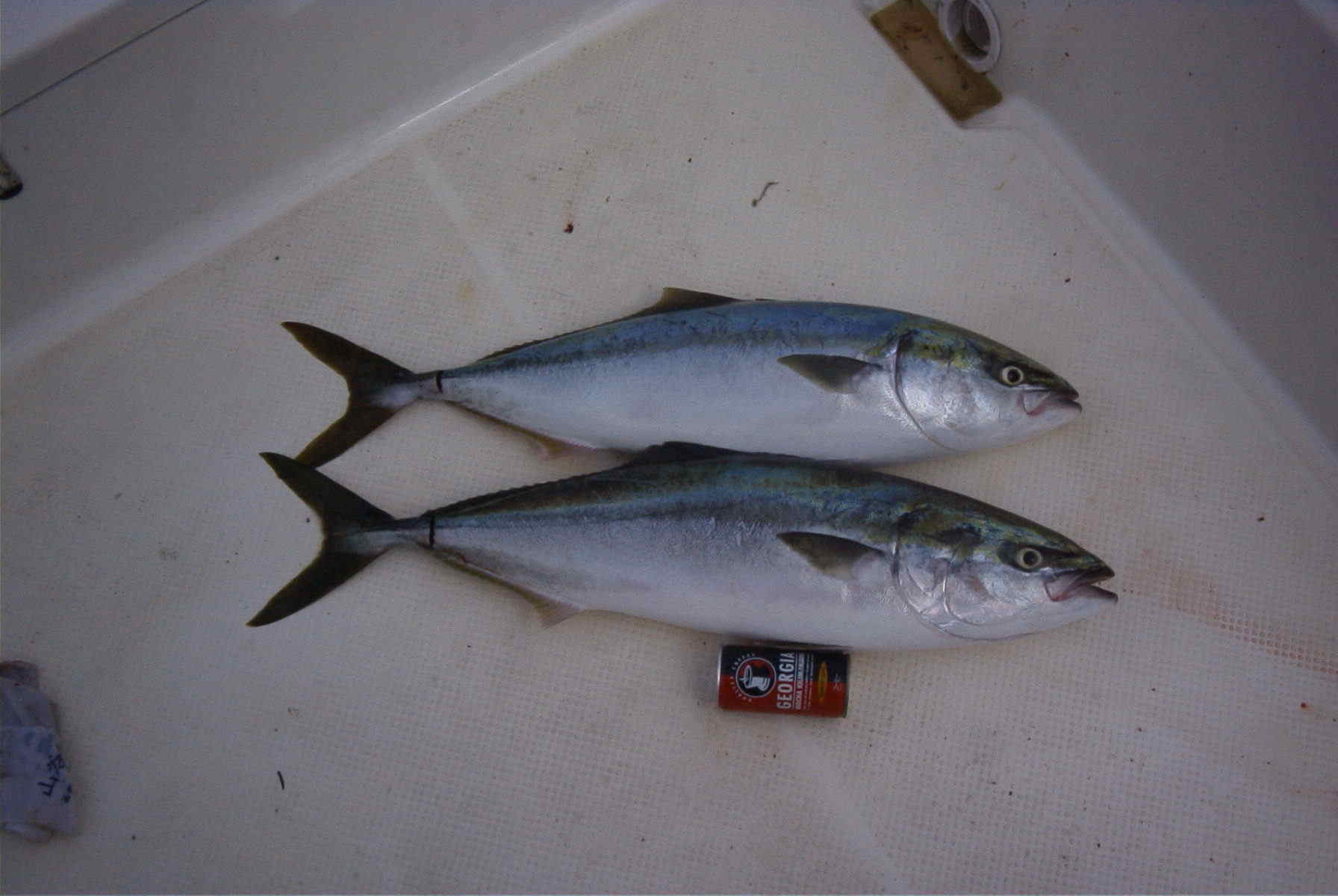 一人で3時半出航。70mラインでジグ引張ってました。周りが船だらけになったので 何箇所か場所を変えてやってました。 90mライン、底から10mくらいで2本掛けました。 2匹とも70cm。重量は計りがないので未計測。 |