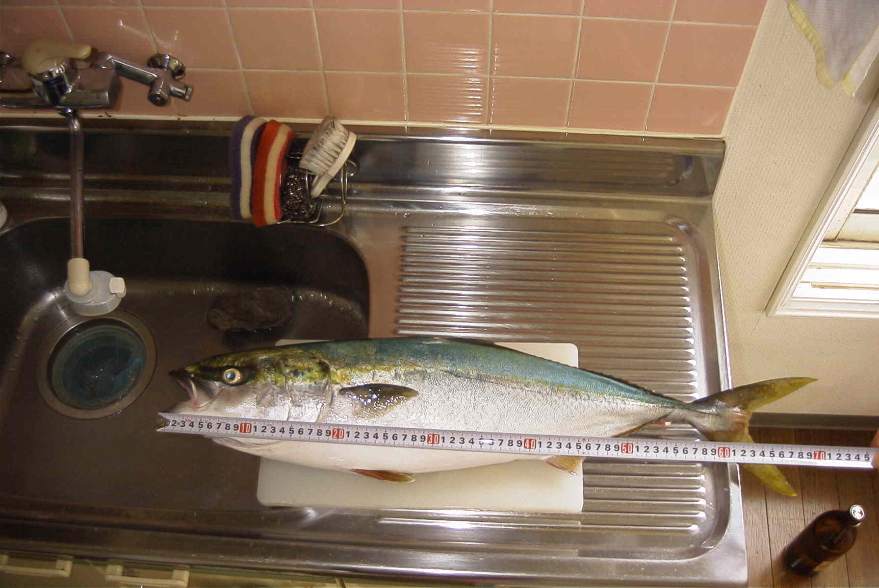 4時半一人で出航。イカを数匹とってからエサ&ジギング。 80cmのブリをエサでゲット。 これで今期5本目 |