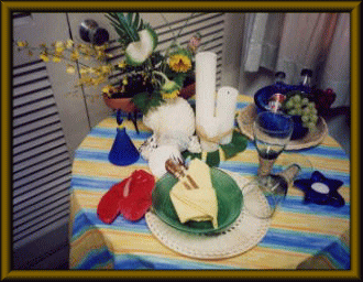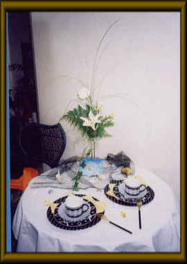 〜海辺のテーブル〜 トロピカル風にまとめました。 ブルーのガラスのボウルを クーラーに・・・。 〜夏のテーブル〜 涼しく白のクロスに 黒のカップでモノトーンに・・ 黄色のナフキンをアクセントに・・