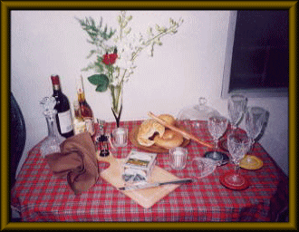〜秋のテーブル〜 オレンジ系の色でまとめました。 収穫した作物を飾りに・・。 〜ワインのテーブル〜 暖かい感じを出す為に、赤のチェックの クロスを使いました。 ワイングラスに花を生けています。