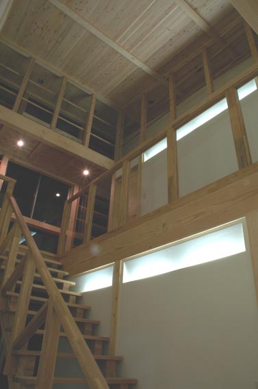 を活かすため、特に風の通り抜ける工夫をし、2階の連続した高窓は、デザイン的なアクセントにもしています。また、照明は、