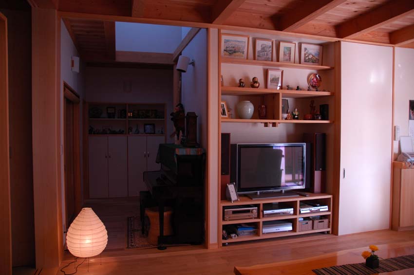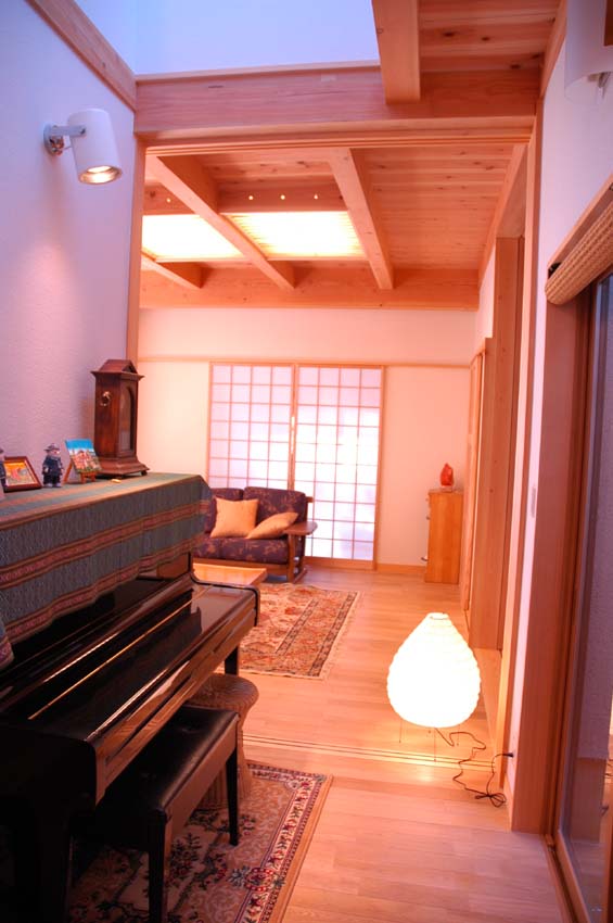 ■ 壺 庭 の あ る 家 ■ この家の中央・西寄りには、ちょうど壺にはまったように、2畳ほどの小さな光庭があり、この小さな壺庭に面して 客間・書斎・主寝室・ピアノを置く廊下が面しています。夏期には、この庭から涼しい風が入ってきて、眺める庭とし ても、採光・通風を得る庭としても小さいながら効果絶大です。まさにこの家の壺といえます。