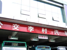 バスターミナルで 我楽村行きのバスを探します
