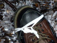 ![]() | ![]() そうこうしていると右足のシューズのフェルトが(3年目) 剥がれしまいました。幸いカディスニンフさんが側に 居てくれ包帯で縛ったら良いと貸してくれました。 お陰さまでその後も楽しく釣りが出来、感謝、感謝。 |