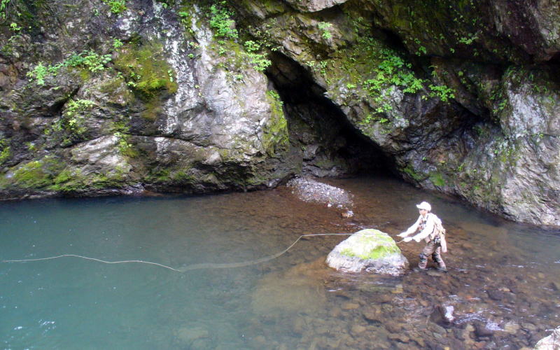 ![]() ▲入渓点にある淵(エリアA) かなりフラットな流れなのでこれはやばい、魚がウブであれば問題はないのだが時期的に毛鉤に対し学習しているはず。 フックサイズは#11、ハリス(ティペット)5X、一投目で反応はするが反転、フライをローテイションするたびに 反応はあるが咥えない。しかたなくハリスを7Xにしてフックサイズを#15に落とす。 7Xだと掛かった時、不安。出来るだけハリスを水面に付けない様に振り込む。毛鉤はゆっくり下流へ向かう。 ボコッ、毛鉤が吸い込まれた。引きが強い。なかなか寄りません。バレない様に祈るだけ。 |