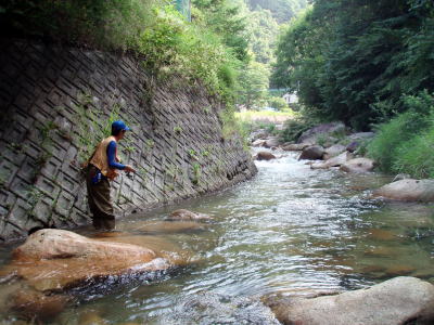 | 盆の入りなんですが行ってしまいました。同行者はルアーマン1人、と餌釣り師2人、山梨県の某渓流、涼しく快適な釣りが 出来ました。だが流石に釣り人が多く釣果は今一でしたが良いアマゴにめぐり会えた。 |