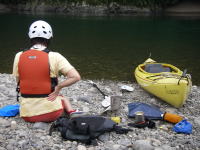 ■(上)木陰のある浜に上陸。小休止といいながら,あまりの風の気持ちよさに長居をしてしまう。 ■(写真左)あらいぐまのパドリング。今期,モンベルのライフジャケットを新規にした。 ■(写真中)中津川の流れ込みに向かう。山は吾妻山である。 |