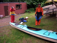 ![]() ■6時間のパドリングを楽しみ,myファルトを解体するキティK氏。本日は風が引き起こす波とたたかい,パドリングを向上させた。 ■(写真左)ランチタイムは入り江の浜に上陸。あまりの気持ちよさに泳いでいるあらいぐまである。 |