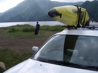 ■午前8時30分,秋元湖キャンプ場に到着。キティK氏はmyファルトを組み立てに入る。 |