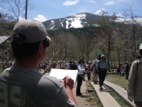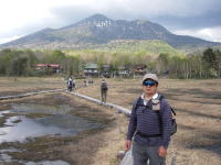 | ■さすがに6月の土曜日。木道は人人人である。ここは,山の鼻から原に出た付近だ。 | ■地塘の水質調査をしていたのは尾瀬高校の生徒たち。将来は環境保護のレンジャーになってほしい。 | ■尾瀬の定番のポイントである大堀川付近だ。至仏バックにここは外せない。 |
