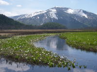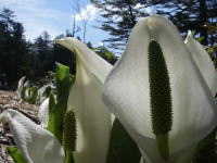 | ■リュウキンカ。「立金花」と書く。くっきりとした黄色の花が元気でいい。 | ■水芭蕉。白いところはガクである。尾瀬で見る水芭蕉がやっぱり美しい。 | ■長蔵小屋付近から見る燧ケ岳。この地点で昼食にした。 |