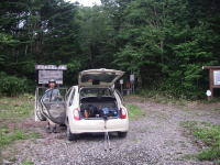 | ■川を渡る場所もある。と言っても,橋という感じではなく,倒木を渡るという雰囲気だ。バランスを崩すと沢に落ちる。 | ■これが,「原始ケ原」。どうやらこのような風景が広がっているのだ。時間が限られていたのと,木道があるわけでもないので,ナビなしでは戻ってこれないと判断して,原の入口付近をちょいと巡って戻ることにする。 | ■ここが,原始ケ原の出入り口となる駐車場。トイレもある。富良野岳へのルートにもなっている。 |