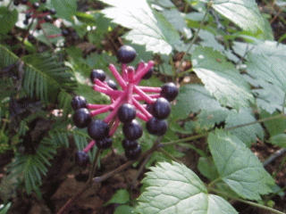 | 野幌森林公園内では頻繁に見かける花ではないので発見は運頼み(比較的簡単に見かける人もいるそうなので、場所が違うのかも知れません)。白い小さな花が密集した繊細な花です。反面、実は黒く枝が真っ赤なのですぐにわかります。個人的にはヤマブドウに似ている感じがします。 |