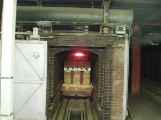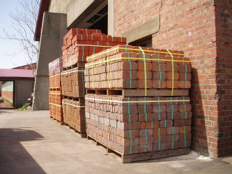 | 配送待ちのれんが製品。敷地内にはいたるところに製品が積まれております。角のとれた丸味を帯びたレンガなどもあります。 | トンネルキルン。レールの上を台車が走り焼成が行われ製品が出来あがります。製品によりますが、焼き上がりまでに1日〜1日半程度かかるそうです。 |