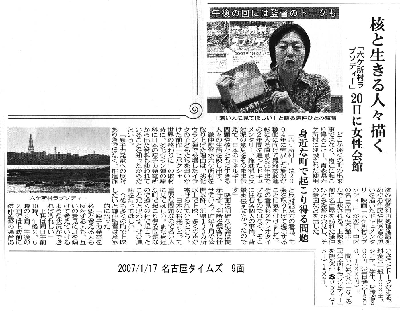 2007年1月20日に名古屋で『六ヶ所村ラプソディー』を上映したおり、鎌仲監督に午後の部と夜の部で講演していただきました。