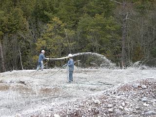 ところが道路から離れているとダンプカーかーのタイヤについたフェロシルトを洗い落とすこともない。そのため道路にフェロシルトの塊が落ちていたり、道に敷いた鉄板にフェロシルトの粒子が積もっている。搬出車のタイヤ洗いは六価クロムやウラン、トリウムの飛散を避けるために必要で大切なことである。
