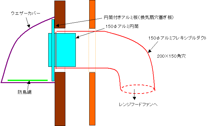 必要部材 換気扇穴塞ぎ板、アルミフレキダクト(以上A店と同じ)+防鳥網