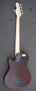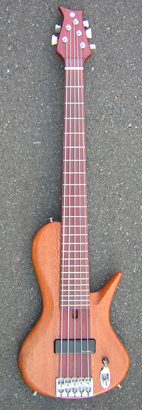 とにかく丈夫で、ネックやチユーニングが安定していて、トラブルレスなものが欲しかったのです。 スケールは880mm(普通のロングスケール、864mmよりちょっと長い)、弦ピッチは5,5弦という感じでかなり広くしています。ネックはパドゥク、ボディウイングはレースウッド、指板はパープルハート、PUはケント・アームストロング、マシンヘッドはスパーゼル、ブリッジはヒップショット。 アクティブのベースを使うことが多いd)小生ですが、これはパッシブ、1volと、ライブで操作を間違えない仕様になっています。 ソリッドにも関わらず、生音もかなりよく鳴ります。 |