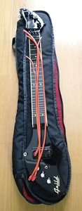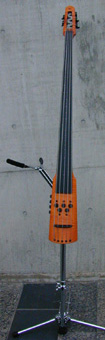 エレクトリック・アップライトは、アルコ(ボウイング)、スラップなどができ、表現力豊かだ。しっかりした三脚がついていて、体で楽器を支える必要がないので、楽だ。また、普通のウッド・ベースのように使えるエンドピン・スタンドもある。 弦は、コントラバス用の弦も(ボディの裏に回して)張れるが、高価で不経済なので専用の弦(フラットワウンド)を張っている。 |