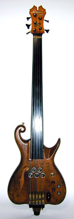 5弦でフレットレスでマグネティックとピエゾの2つのPUがついているベースが欲しくて、アトランシアで作ってもらいました。 アトランシアの方で「ピエゾだけのは作ったことがあるが、回路の設計に時間がかかるかもしれない」と言われましたが、納得のいく物ができました。しかし驚いたのはその3ヶ月後のことです。ベースマガジンの新製品紹介で、サウンドホールの形だけが違う見慣れたベースが載っているじゃあ〜りませんか。ちなみにピッチはブリッジのところで18mm、スケールは900mm (36in.)。フレットレスで不足しがちなサスティンを補うのもありますが、それよりもスケールが長い方が音程がとりやすいんではないか、と思ってそうしました。弦はダダリオのクロームス(つるつるのフラット・ワウンド)のスーパーロング。フラット・ワウンドを張る場合、これしか選択肢がないのです。 20年経っても、ネックの調整をしたことがありません。 |
