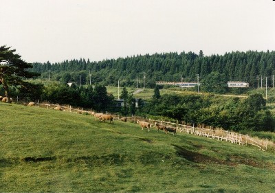 羊牧場を横目に走る583系「はつかり」(1989年8月撮影)