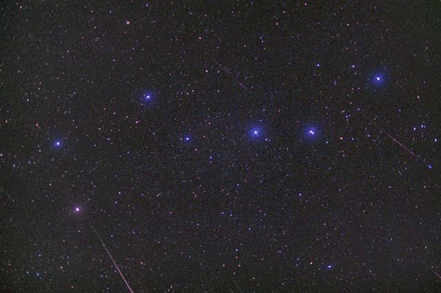 北斗を往く流星 流星が北斗七星に突き刺さる様です。 カメラを向けるまではこの方角に数多く飛んでいましたが、 カメラを向けたとたんに別の方角が増えたような気が・・・ それでも5個、写っています。 2001年11月19日 4時37分〜5時10分 フジカST801 55mmF1.8 コニカJX400 back