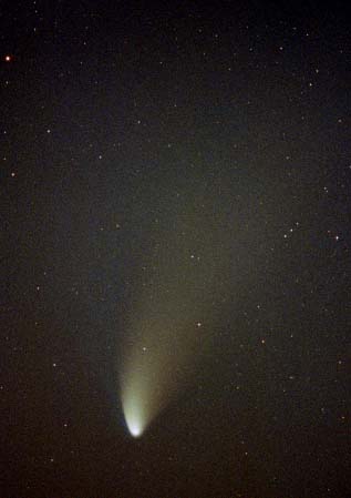 ヘール・ボップ彗星 1997年4月26日 19時34分 露出9分 ミノルタXD 135mmF3.5 フジカラー G−800 撮影地:富士山西臼塚駐車場 平地の空はもう一つなので、少し でも暗い空を求めて遠出しました。 さすがに標高の高い所は良く見えます。 まるまると太った姿が印象的でした。 back