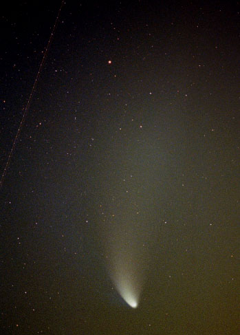 ヘール・ボップ彗星 1997年5月1日 19時55分 露出10分 ミノルタXD 135mmF3.5F4 フジカラー G−800 撮影地:愛知県豊根村 茶臼山 夕方の高度も低くなり、まもなく 見納めの時期です。 ダストテイルが一段と太くなり 堂々とした姿を見せていました。 5月中旬まで見えていましたが その後、薄明の中に消えてゆきました。 これで寝不足、残業無しの生活ともお別れ。 感動をありがとう! back