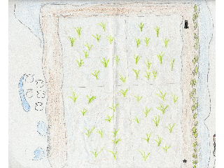 まず、城あとを敵が入ってこないようにつくってある「土るい」という土かべを一つづつ歩いて、歩数を数えます。たては、幅11歩、長さ104歩で、横は幅7歩、長さ103歩でした。
