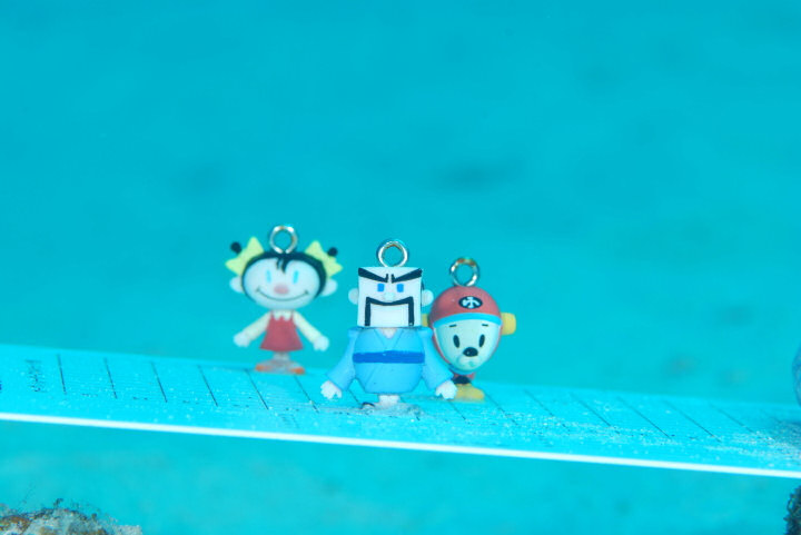 後景は、遠いためマクロでも広い範囲が写ります。そのため青い自然光量が多いのです。後景にはフラッシュ光が当たる物体がありません。そのためフラッシュから出た光はそのまま海のどこかに消えていきカメラ側に帰ってきません。つまり、後景に七色のフラッシュ光は無関係な為、青い自然光の影響だけを受けます。