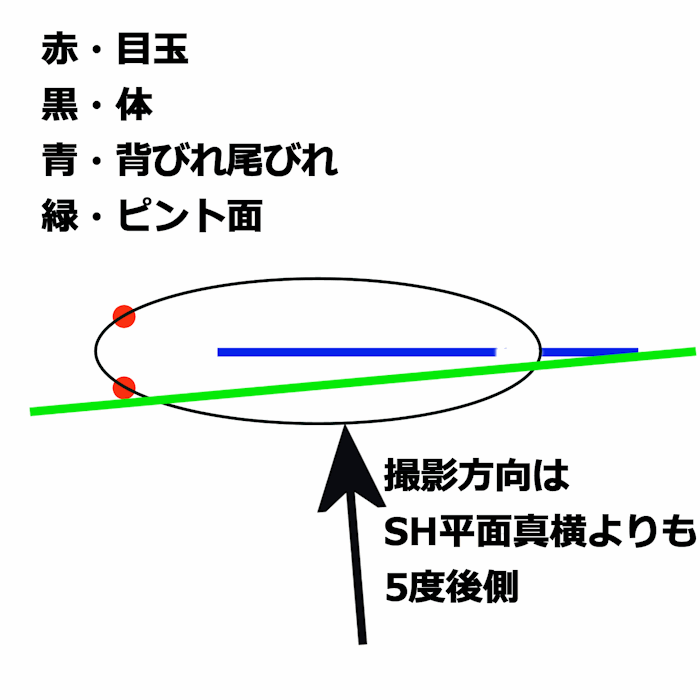 ●顔の表情よりも背びれ尾びれに特徴がある場合は、SH平面真横からではなく5度ほど後側から撮影すると、目ピンと尾びれピンが同じピント面に入ります。顔とヒレのディテールを両立できます。僕はこれをよく使います。