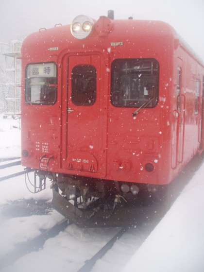 雪が降る中で、左の定期列車(キハ52−115)と顔を合わせた。