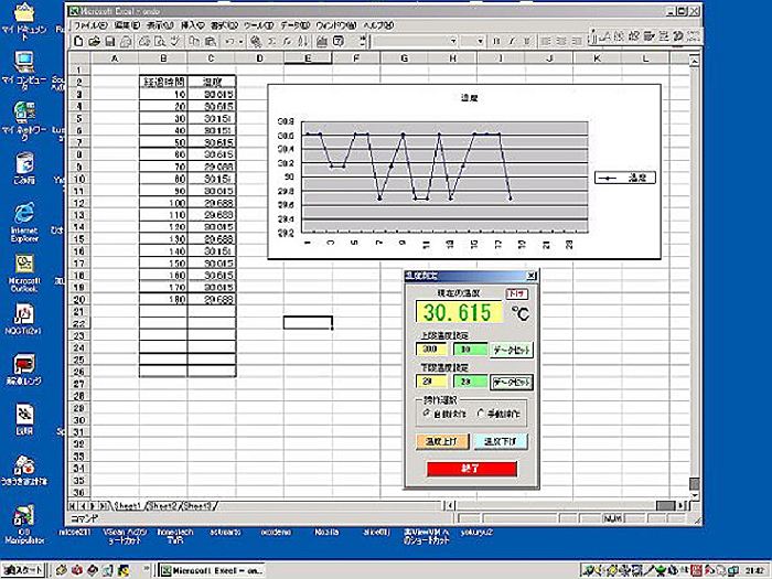 下記はエクセルにて動作させる様に作り直したものです。 エクセルのグラフ表示機能を使えばリアルタイムでグラフが動くので面白いです。次は機器の制御です。PICNICのポート制御機能を利用すれば それほど苦労せずに出来そうですが 経費の問題が壁です。 (^^;