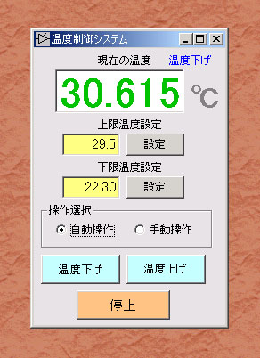 これはPICNICによる温度制御システムですが 遠い場所にある 例えば温室やペットの飼育小屋の温度制御を自動化できないか考えているものです。VBで作成しました。設定値以下になると「注意」と表示されます。また動作設定で自動操作ならびに手動操作が選べます。・・・・温度表示は出来ますが まだ未完成でボタンは飾りです。(^^;