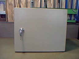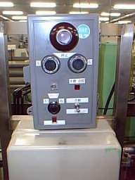 制御盤を正面から見たところです。不要になった部品で作りました。NC機械(プログラムで動かす自動機械)の外部信号(コマンド)で動作するようにしてあります。 |