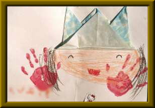 | 「お山でヤッホー」2001.5 手のところは,絵の具で手形を押しました。キティーちゃんのシールが一緒にうつってしまいました。 (長女S) |