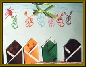 「たけのこ」2001.5 たけのこがみんなで一緒に歌を歌っているところです。たけのこは,折り紙で作りました。黒いたけのこの目が見えなくなってしまいました。 (長女S) |